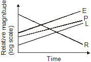 The accompanying graph depicts the relationship between environmental impact (E), world population (P), average standard of living (L) and world resources (R). What is expected, if the world population remains stable but the average standard of living continues to increase