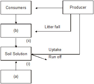 In above simplified model of phosphorus cycling in a terrestrial ecosystem (a), (b), (i), (ii) are respectively-