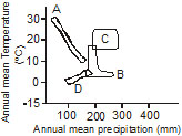 A climograph of various biomes is given-below. The biomes A, B, C and D represent