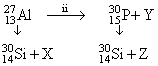 Bombardment of aluminium by a-particle leads to its artificial disintegration in two ways, (i) and (ii) as shown. Products X, Y and Z respectively are,