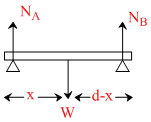 A rod of weight W is supported by two parallel knife edges A and B and is in equilibrium in a horizontal position. The knives are at a distance d from each other. The centre of mass of the rod is at distance x from A. The normal reaction on A is :-