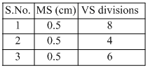 Diameter of a steel ball is measured using a vernier callipers which has divisions of 0.1 cm on its main scale(MS) and 10 divisions of its vernier scale (VS) match 9 divisions on the main scale. Three such measurementsfor a ball are given as :