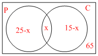 65 + 25 - x + x + 15 - x = 100 ⇒ 105 - x = 100 ⇒ x = 5