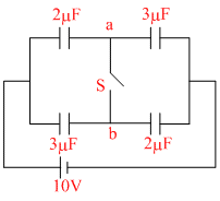 In figure is shown a system of four capacitors connected across a 10 V battery. Charge that will flow from switch S when it is closed is :