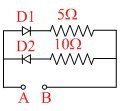 A 2V battery is connected across AB as shown in the figure. The value of the current supplied by the battery when in one case battery′s positive terminal is connected to A and in other case when positive terminal of battery is connected to B will respectively be :