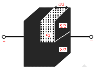 A parallel plate capacitor having plates of area S and plate separation d, has capacitance C1 in air. When two dielectrics of different relative permittivity (ε1 = 2 and ε2 = 4) are introduced between the two plates as shown in the figure, the capacitance becomes C2. The ratio