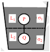 Two spheres P and Q of equal radii have densities ρ1 and ρ2, respectively. The spheres are connected by a massless string and placed in liquids L1 and L2 of densities σ1 and σ2 and viscosities h1 and h2, respectively. They float in equilibrium with the sphere P in L1 and sphere Q in L2 and the string being taut (see figure). If sphere P alone in L2 has terminal velocity