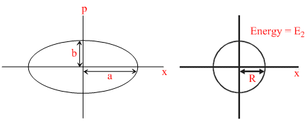 Two independent harmonic oscillators of equal mass are oscillating about the origin with angular frequencies ω1 and ω2 and have total energies E1 and E2, respectively. The variations of their momenta p with positions x are shown in the figures. If