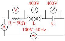 In the series LCR circuit as shown in figure, the voltmeter and ammeter readings are :