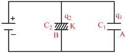 In the adjoining diagram two geometrically identical capacitors A and B are connected to a battery. Air is filled between the plates of C1 and a dielectric is filled between the plates of C2, then -