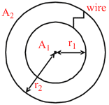 Two spherical conductors A1 and A2 of radii r1 and r2 are placed concentrically in air. The two are connected by a copper wire as shown in figure. Then the equivalent capacitance of the system is
