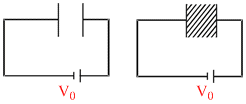 A parallel plate air capacitor is connected to a battery. The quantities charge, electric field and energy associated with this capacitor are given by Q0, V0, E0 and U0 respectively. A dielectric slab is now introduced to fill the space between the plates with the battery still in connection. The corresponding quantities now given by Q, V, E and U are related to the previous one as ;