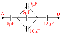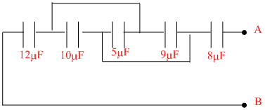 Five capacitors together with their capacitances are shown in the adjoining figure. The potential difference between the points A and B is 60 volt. The equivalent capacitance between the point A and B and charge on capacitor 5μF will be respectively -