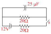 The switch S shown in figure is kept closed for a long time and then opened at t = 0, then the current in the middle 20 Ω resistor at t = 0.25 ms is :