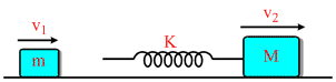 Two blocks of masses m and M are moving with speeds v1 and v2 (v1 > v2) in the same direction on the frictionless surface respectively, M being ahead of m. An ideal spring of force constant k is attached to the backside of M (as shown). The maximum compression of the spring when the block collides is :
