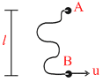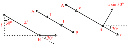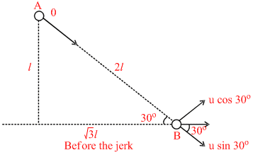 Two particles A and B each of mass m are attached by a light inextensible string of length 2l. The whole system lies on a smooth horizontal table with B initially at a distance l from A. The particle at end B is projected across the table with speed u perpendicular to AB. Velocity of ball A just after the jerk is -