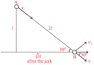 When the string becomes tight, both particles begin to move with velocity components v in the direction AB. Using conservation of momentum in the direction AB