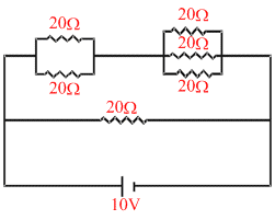 Three copper wires of lengths and cross sectional areasare (l,A), (2l,A/2) and(l/ 2,2A). Resistance is minimum in...A galvanometer of resistance G, is shunted by a resistance SΩ. To keep the main current in the circuit unchanged, t...If each resistance in the fig. is of 9 Ω then reading of ammeter is : -...The current I drawn from the 5 volt source will be...An electric current is passed through a circuit containing two wires of the same material, connected in parallel. If the...
