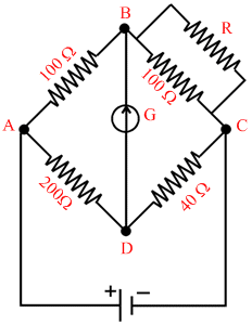 The given Wheatstone bridge is showing no deflection in the galvanometer joined between the points B and D (Figure). Calculate the value of R.