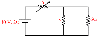 For a particular resistance X in the figure shown the thermal power generated in ′Y′ is maximum when Y = 4Ω. Then X is: