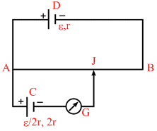 In the fig. the potentiometer wire AB of length L & resistance 9 r is joined to the cell D of e.m.f. ε & internal resistance r. The cell C′s e.m.f. is ε/2 and its internal resistance is 2r. The galvanometer G will show no deflection when the length AJ is: