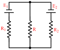 In a circuit shown in figure resistances R1 and R2 are known, as well as emf′s E1 and E2. The internal resistances of the sources are negligible. At what value of the resistance R will the thermal power generated in it be the highest ?