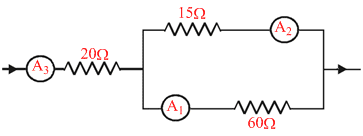 If the reading of ammeter A3 in figure is 0.75 A. Neglecting the resistances of the ammeters, the reading of ammeter A2 will be :