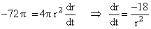 A spherical balloon is filled with 4500π cubicmeters of helium gas. If a leak in the balloon causes the gas to escape at the rate of 72π cubic meters per minute, then the rate (in meters perminute) at which the radius of the balloon decreases 49 minutes after the leakage began is :