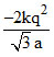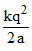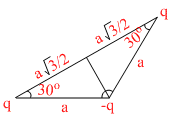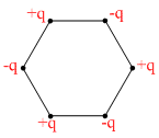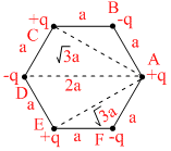 Six charges of magnitude + q and −q are fixed at the corners of a regular hexagon of edge length a as shown in the figure. The electrostatic potential energy of the system of charged particles is :