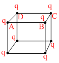 Eight point charges (can be assumed as uniformly charged small spheres and their centres at the corner of the cube) having value q each are fixed at vertices of a cube. The electric flux through square surface ABCD of the cube is