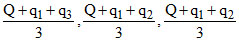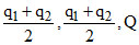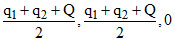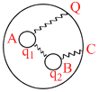 Two small conductors A and B are given charges q1 and q2 respectively. Now they are placed inside a hollow metallic conductor (C) carrying a charge Q. If all the three conductors A, B and C are connected by conducting wires as shown, the charges on A, B and C will be respectively: