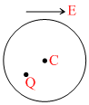 A positive point charge Q is kept (as shown in the figure) inside a neutral conducting shell whose centre is at C. An external uniform electric field E is applied. Then :