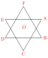The magnitude of electric force on 2 μ c charge placed at the centre O of two equilateral triangles each of side 10 cm, as shown in figure is P. If charge A, B, C, D, E & F are 2 μ c, 2 μ c, 2 μ c, -2 μc, - 2 μ c, - 2 μ c respectively, then P is: