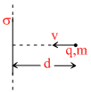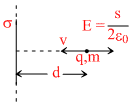The particle of mass m and charge q will touch the infinitely large plate of uniform charge density σ if its velocity v is more than: {Given that σ q > 0}