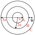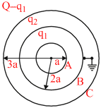 Figure shows a system of three concentric metal shells A, B and C with radii a, 2a and 3a respectively. Shell B is earthed and shell C is given a charge Q. Now if shell C is connected to shell A, then the final charge on the shell B is equal to :