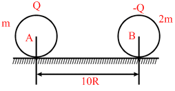 Two smooth spherical non conducting shells each of radius R having uniformly distributed charge Q & - Q on their surfaces are released on a smooth non-conducting surface when the distance between their centres is 10 R. The mass of A is m and that of B is 2 m. The speed of A just before A and B collide is: [Neglect gravitational interaction]