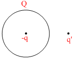A thin, metallic spherical shell contains a charge Q on it. A point charge −q is placed at the centre of the shell and another charge q′ is placed outside it as shown in fig. All the three charges are positive. The force on the charge at the centre is