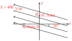 A uniform electric field of 400 V/m exists in space as shown in graph. Two points A and B are also shown with their co-ordinates. The potential difference VB − VA in volts is :