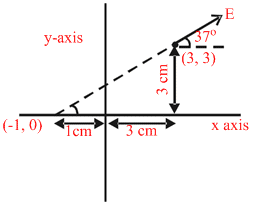 The electric field produced by a positively charged particle, placed in an xy-plane is 7.2 (4î + 3ĵ) N/C at the point (3 cm, 3cm) and 100 î N/C at the point (2 cm, 0).