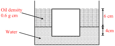 A cubical block of wood 10 cm on a side, floats at the interface of oil and water as shown in figure. The density of oil is 0.6 g cm-3 and density of water is 1 g cm-3. The mass of the block is