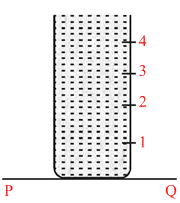A cylindrical vessel of 90 cm height is kept filled upto the brim as shown in the figure. It has four holes 1, 2, 3, 4 which are respectively at heights of 20cm, 30 cm, 40 cm and 50 cm from the horizontal floor PQ. The water falling at the maximum horizontal distance from the vessel comes from