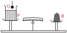 Figure shows a weighing-bridge, with a beaker P with water on one pan and a balancing weight R on the other. A solid ball Q is hanging with a thread outside water. It has volume 40 cm3 and weighs 80 g. If this solid is lowered to sink fully in water, but not touching the beaker anywhere, the balancing weight R′ will be