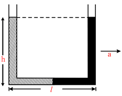 A U-tube of base length ″lτ filled with same volume of two liquids of densities ρ and 2ρ is moving with an acceleration ″a″ on the horizontal plane as shown in the figure. If the height difference between the two surfaces (open to atmosphere) becomes zero, then the height h is given by: