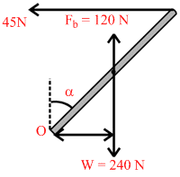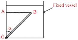 A uniform rod OB of length 1m, cross-sectional area 0.012 m2 and relative density 2.0 is free to rotate about O in vertical plane. The rod is held with a horizontal string AB which can withstand a maximum tension of 45 N. The rod and string system is kept in water as shown in figure. The maximum value of angle α which the rod can make with vertical without breaking the string is