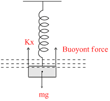A block of density 2000 kg/m3 and mass 10 kg is suspended by a spring stiffness 100 N/m. The other end of the spring is attached to a fixed support. The block is completely submerged in a liquid of density 1000 kg/m3 If the block is in equilibrium position.