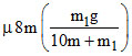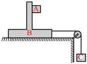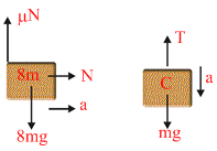In the arrangement shown in the figure mass of the block B and A are 2 m,, 8 m respectively. Surface between B and floor is smooth. The block B is connected to block C by means of a pulley. If the whole system is released then the minimum value of mass of the block C so that the block A remains stationary with respect to B is : (Co-efficient of friction between A and B is m and pulley is ideal)
