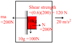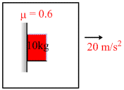 Car is accelerating with acceleration = 20 m/s2. A box of mass m = 10 kg that is placed inside the car, it is put in contact with the vertical wall of car as shown. The friction coefficient between the box and the wall is m = 0.6.