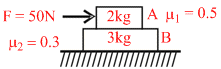 A man of mass m is applying a horizontal force to slide a box of mass m′ on a rough horizontal surface. It is know...A plank is held at an angle a to the horizontal (Fig.) on two fixed supports A and B. The plank can slide against the su...In the shown arrangement if f1, f2 and T be the frictional forces on 2 kg block, 3kg block & tension in the string respe...Two clocks A and B are being tested against a stranded clock located in the national laboratory At 10 : 00 AM by the sta...In the figure, a ladder of mass m is shown leaning against a wall. It is in static equilibrium making an angle θ wi...