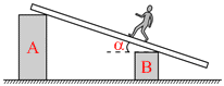 A plank is held at an angle a to the horizontal (Fig.) on two fixed supports A and B. The plank can slide against the supports (without friction) because of its weight Mg. With what acceleration and in what direction, a man of mass m should move so that the plank does not move.