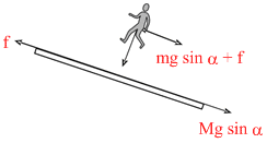 If the friction force is taken up the incline on man, then application of Newton′s second law to man and plank along incline yields.